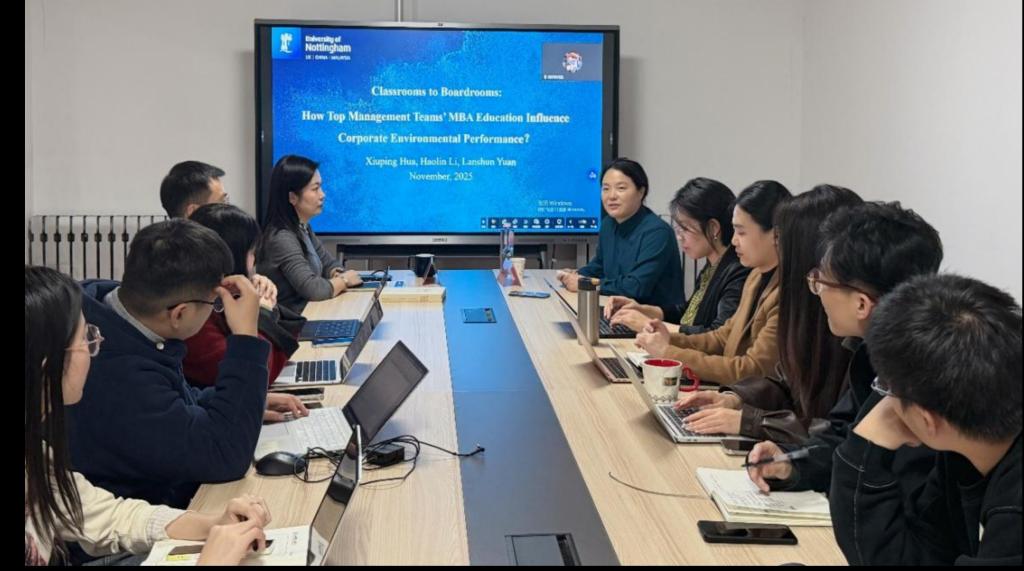 华秀萍教授以“Classrooms to Boardrooms: How Top Management Teams’ MBA Education Influence Corporate Environmental Performance?”为题为师生们做了精彩的学术报告,报告系统探讨了高管团队的 MBA 教育如何影响企业环境行为这一前沿议题。她从联合国“负责任管理教育原则”(PRME)的发展背景谈起,指出全球商学院在可持续发展教育方面呈现加速推进趋势。随后,她基于“务实成本假说”和“情感价值假说”构建理论分析框架,深入阐释了 PRME 导向的 MBA 教育如何塑造管理者的可持续价值观,并通过声誉压力、信息披露质量等机制推动企业提升环境绩效;并指出这一影响在小型企业、民营企业以及具有海外经验的企业中效果更加明显,呈现了管理教育与企业环境治理之间的内在联系。
