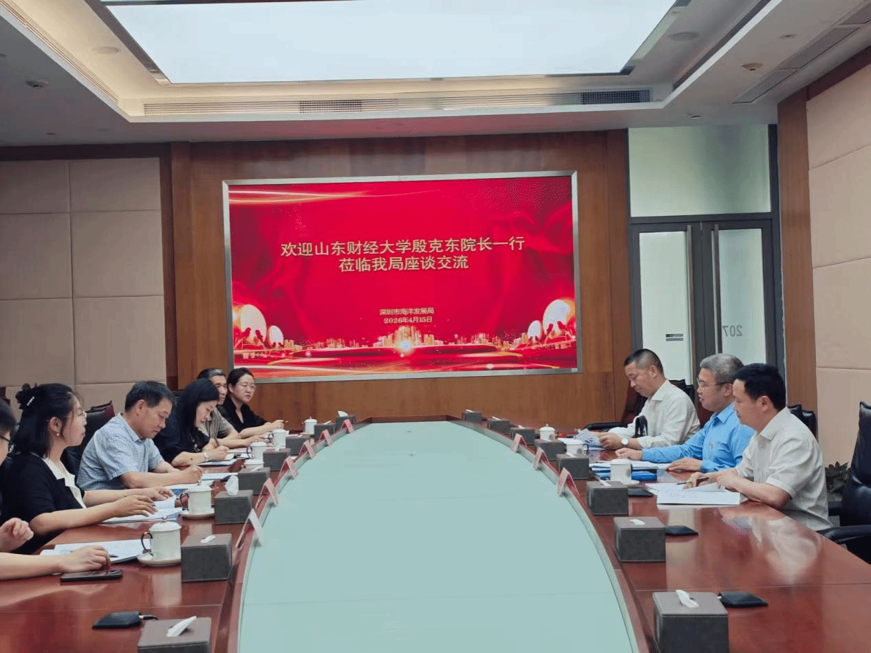 2026年4月15日,山东财经大学经济学院院长、海洋经济与管理研究院院长殷克东教授,海洋经济与管理研究院副院长黄冲副教授、金雪副教授、赵宇峰助理研究员与山东财经大学深圳研究院副院长林腾、智库中心主任李瑞雪副教授一行六人,赴深圳市海洋发展局开展调研座谈。深圳市海洋发展局局长陈华平、综合业务处处长苏良生、战略规划处处长黄虎城出席座谈会并陪同调研。