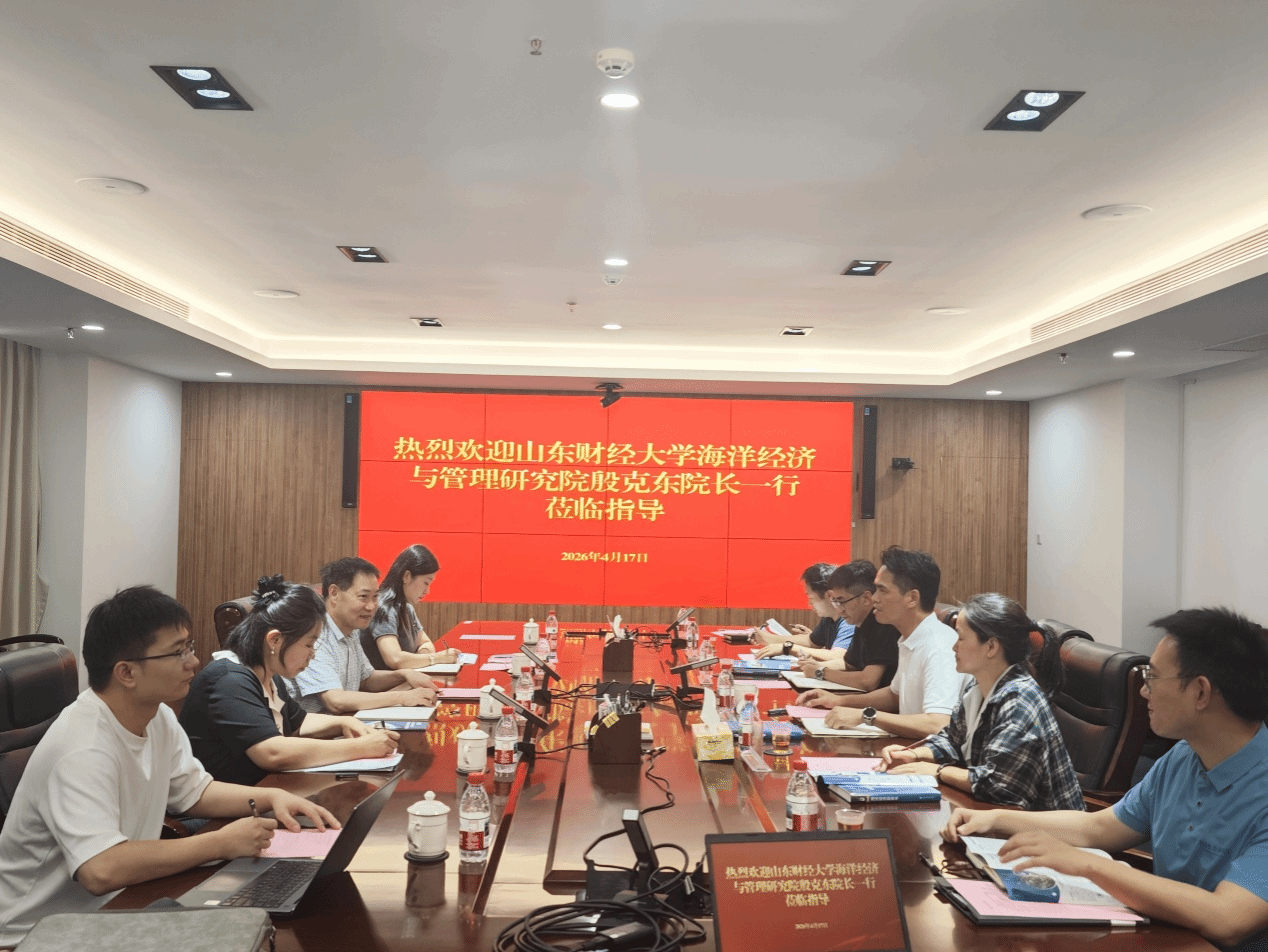 2026年4月17日下午,山东财经大学经济学院院长、海洋经济与管理研究院院长殷克东教授率队赴自然资源部海口海洋中心开展调研交流。海洋经济与管理研究院副院长黄冲、副教授金雪、助理研究员赵宇峰参加调研。自然资源部海口海洋中心党委委员、副主任曾纪胜及有关部门负责同志、业务骨干出席座谈会。