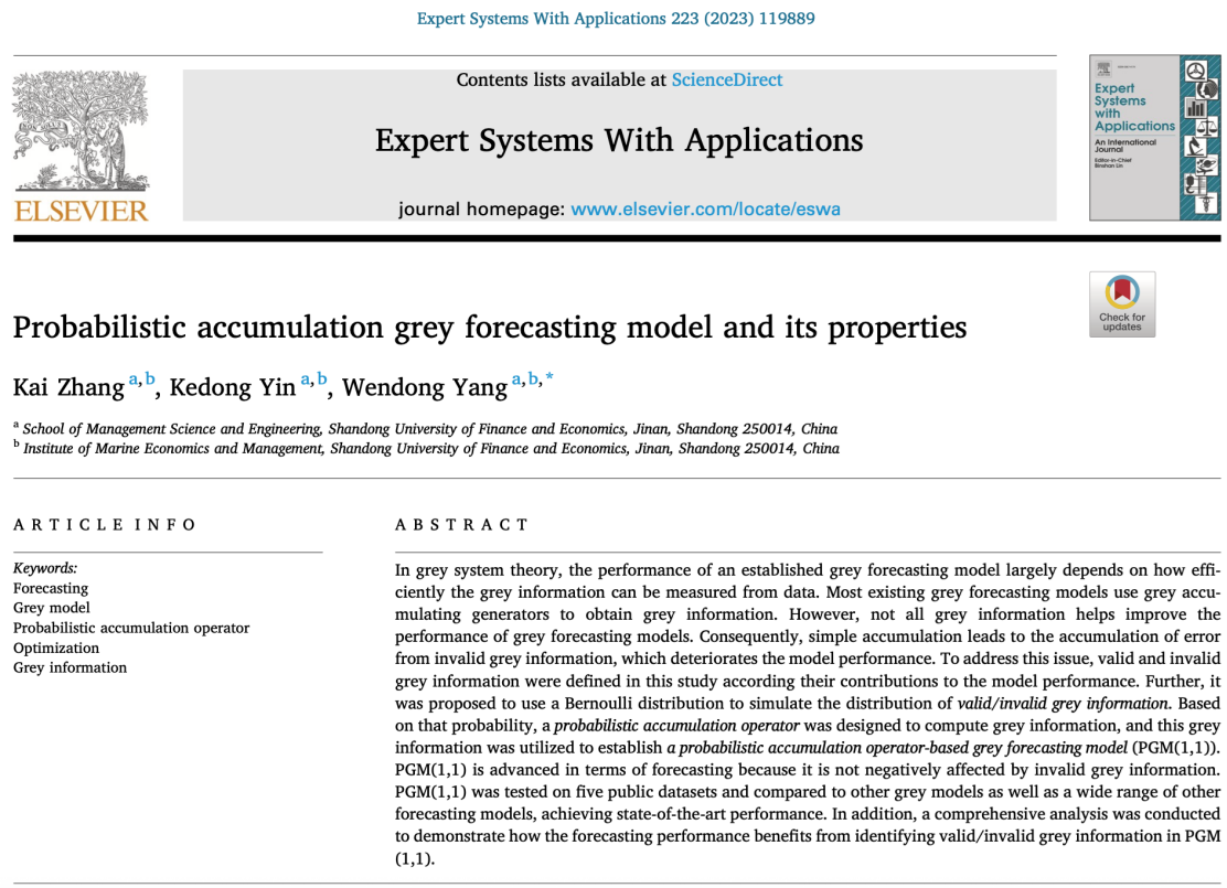 海洋经济与管理研究院殷克东教授与其指导的博士研究生张凯等合作撰写的论文《Probabilistic accumulation grey forecasting model and its properties》,在《Expert Systems with Applications》(2023年8月)在线发表。该刊系我校A1类期刊。