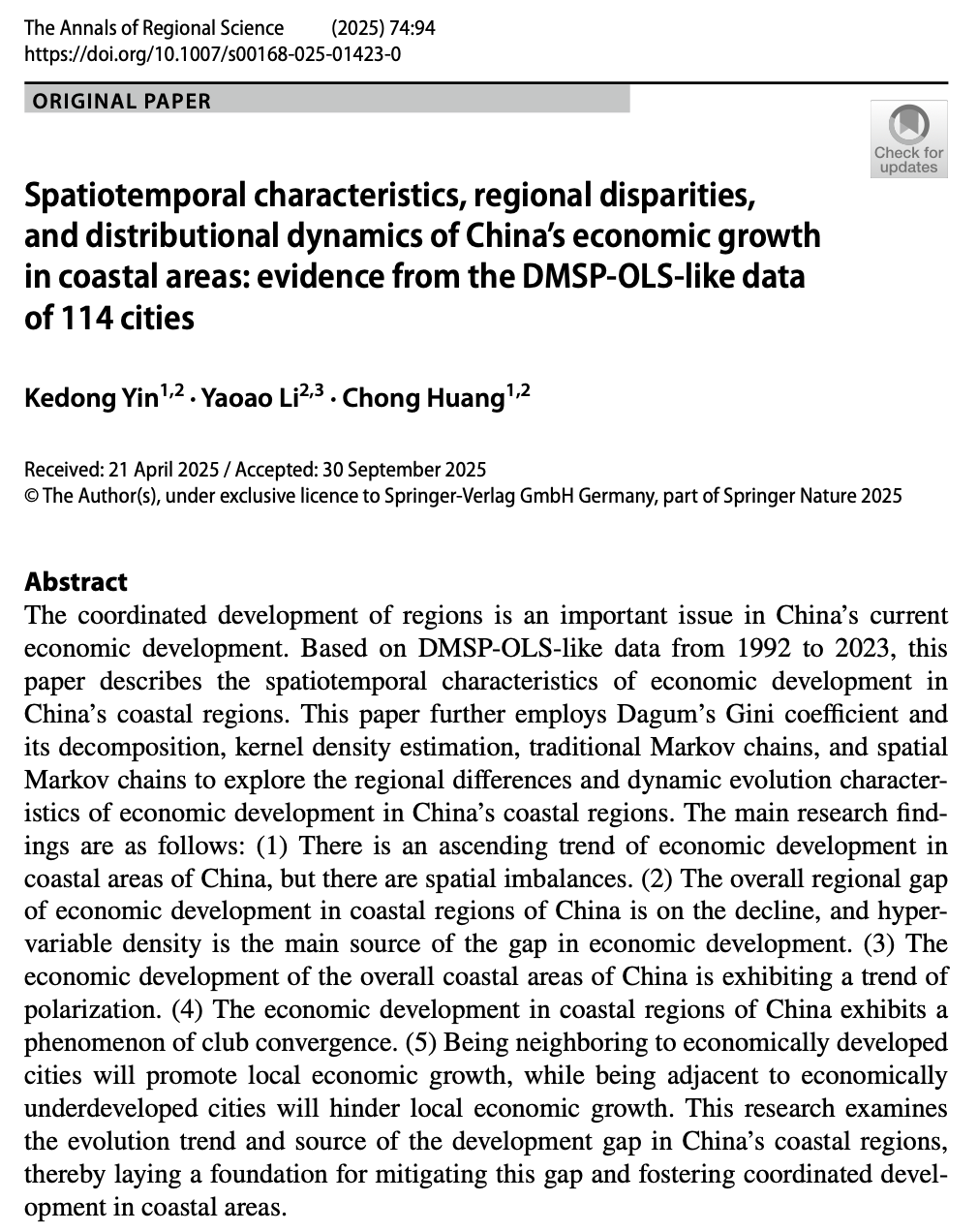 海洋经济与管理研究院殷克东教授与其指导的博士研究生李耀奥等合作撰写的论文《Spatiotemporal characteristics, regional disparities, and distributional dynamics of China’s economic growth in coastal areas: evidence from the DMSP‑OLS‑like data of 114 cities》,在《The Annals of Regional Science》在线发表。该刊系我校A2类期刊。