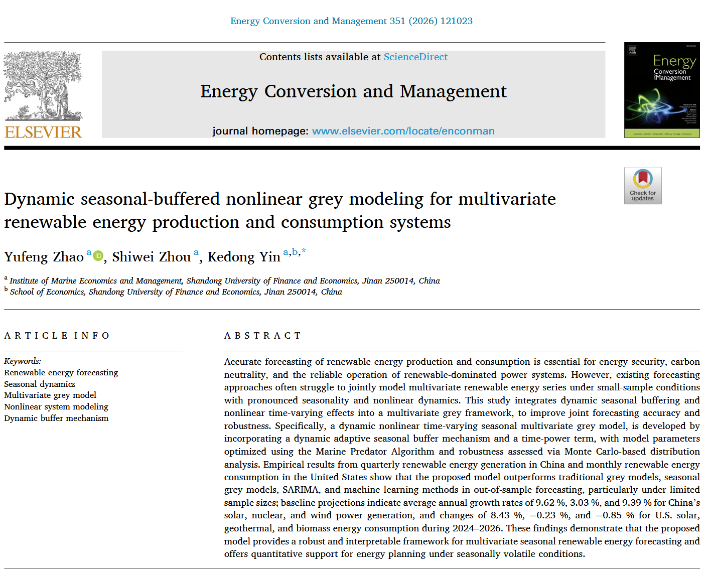 海洋经济与管理研究院赵宇峰博士撰写的论文《Dynamic seasonal-buffered nonlinear grey modeling for multivariate renewable energy production and consumption systems》,在《Energy Conversion and Management》(2026年1月)在线发表。该刊系我校A2类期刊。