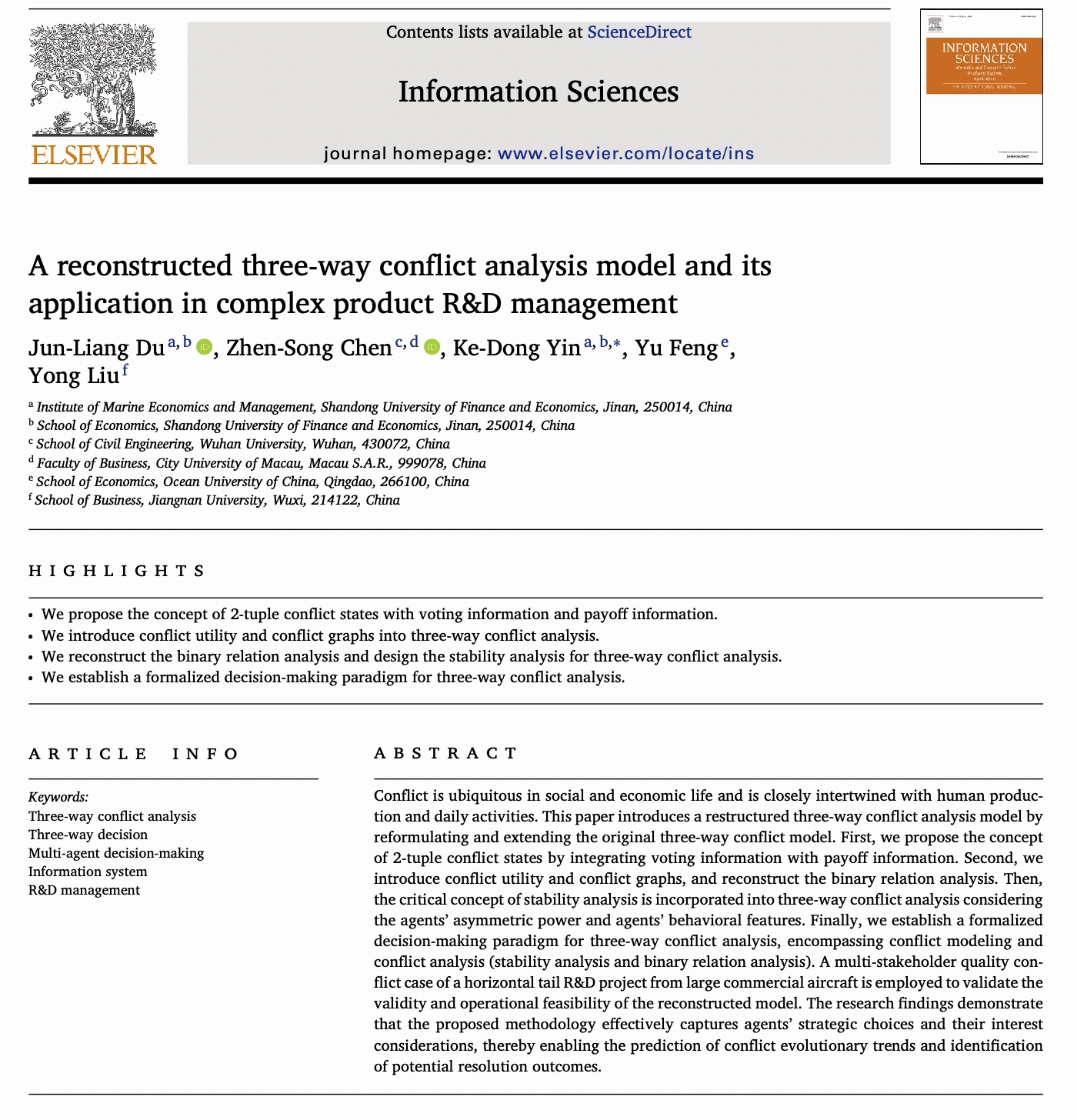 研究院杜俊良博士撰写的论文《A reconstructed three-way conflict analysis model and its application in complex product R&D management》,在《Information Sciences》在线发表。该刊系我校A1类期刊。